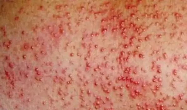 表現(xiàn)為水瘡和紅斑,伴有皮膚組織腫脹現(xiàn)象,很癢,抓撓后有黃色漿液滲出和出血。